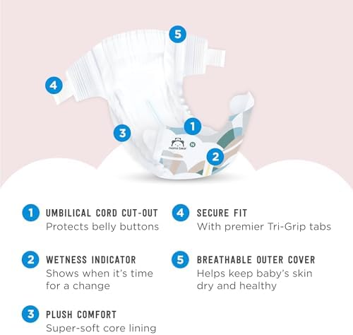 - Stretch fasteners and elastic waistband with premier Tri-Grip tabs for a secure hold around your baby; Each pack contains two diaper designs, White and Cloud Dreams